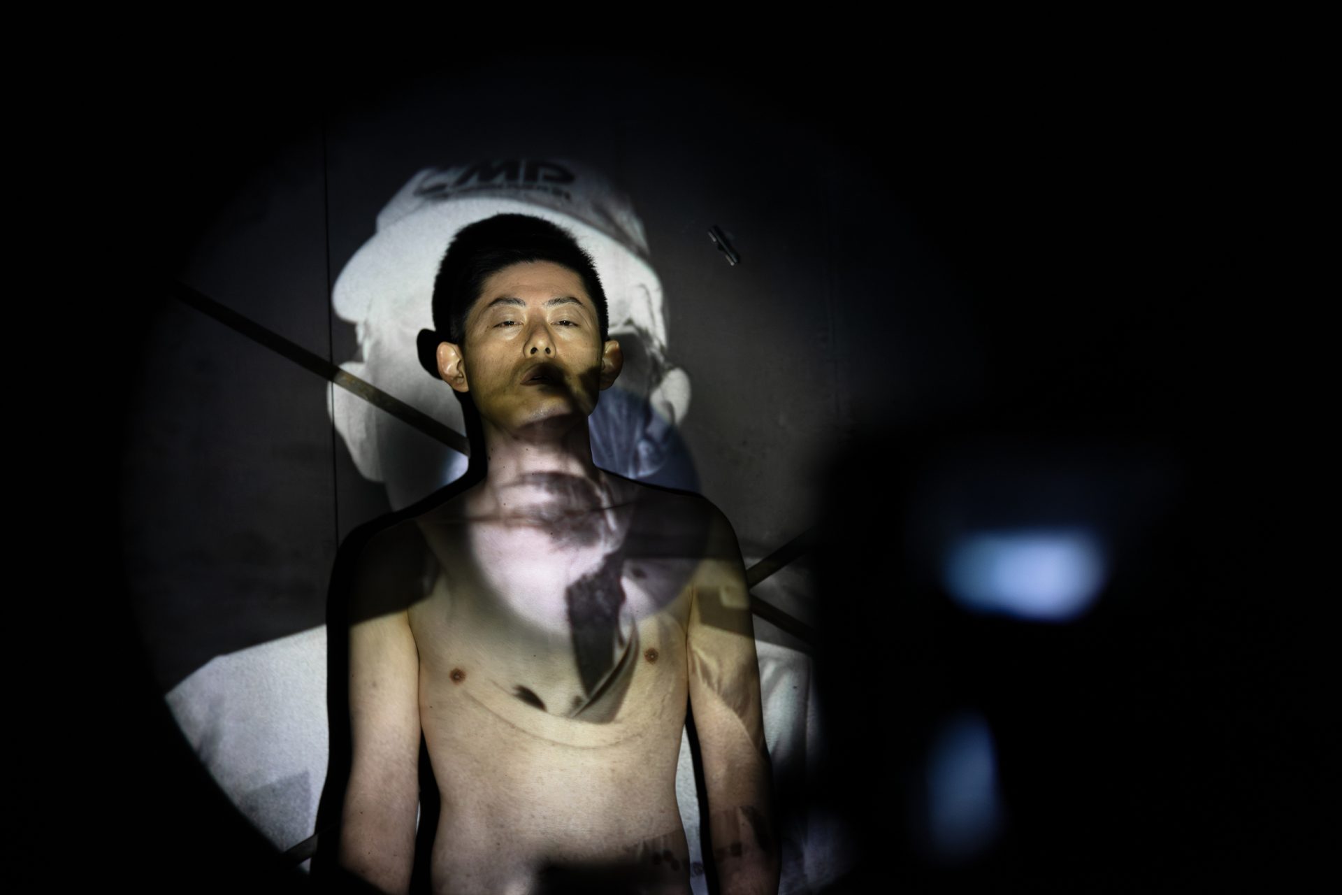 I was also able to witness the performance Maetani gave on the final day of the exhibition. The performance’s title, Walk, Sleep, seems to encompass the dual concepts of ‘movement/borders’ and ‘nation/family’. The former ‘U-STYLE’ building, which served as the venue, brought the idea of camping to mind in a different way. As the sun sank, Maetani took off all his clothes and projected onto his body the collection of photographs from his trek around the Tsugaru Peninsula. His body was turned into a canvas, or a screen. Memories of ACAC as a Base Camp, where I had first met Maetani, flooded into my mind, superimposing themselves onto the hushed and darkened venue. I was brought back to that moment when the lights in the room where the Base Camp participants had gathered were suddenly turned off, simulating a power outage after an imaginary earthquake.