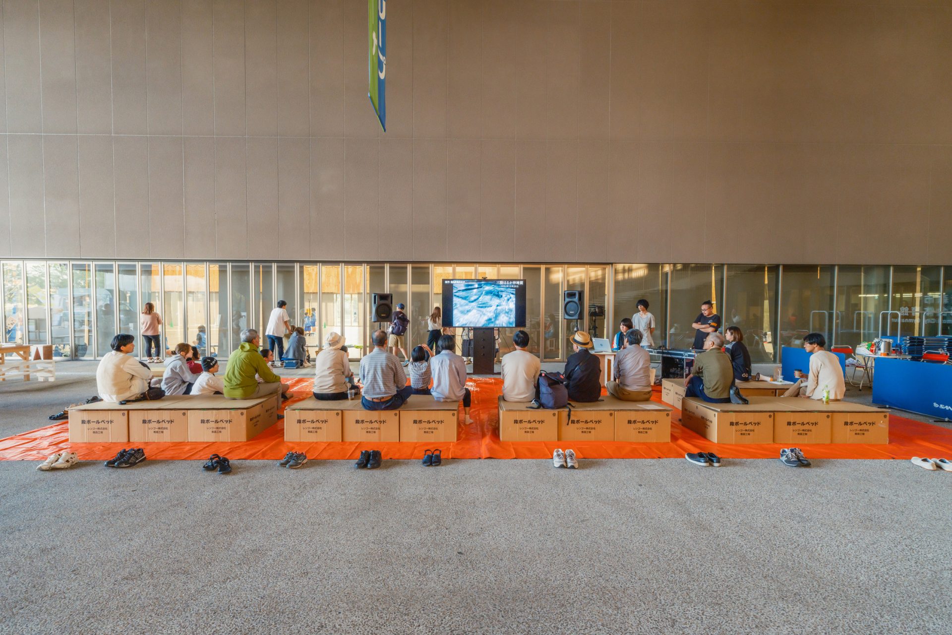 この成果展に先立ち、9月下旬にはACACにて一泊二日を過ごす「ACACベースキャンプ」と、青森市中心部に新設された防災拠点・カクヒログループスーパーアリーナ(青森市総合体育館)で行われた「テント映画祭」を組み合わせた複合プロジェクト「(災害ユートピア)」が開催され、筆者も一参加者としてこれに参加した。改修工事による休館中だからこそ可能となったACACベースキャンプでは、「もしACACで被災したら」という仮定のもと、スタッフやゲスト、青森公立大学の学生を含む参加者全員が、ACAC館内でキャンプを行い、避難訓練を体験するという趣旨が掲げられていた。
