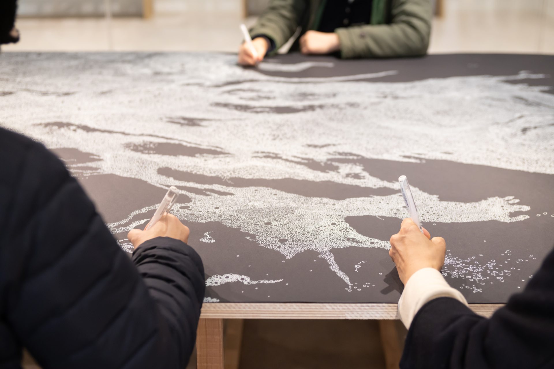 クラークの作品は、タイトル《Confluence(合流)》が示すとおり、一貫して「水」というモチーフへの関心に貫かれている。泡のようにも見える円を、巨大な絵巻物を思わせる紙面に繰り返し描くことで、やがてそれらは川や海の水面として立ち現れる。参加型の作品として、来場者一人ひとりが円を描く行為に関わることで、さまざまな思いが重なり合い、無数の円=泡が合流していく。クラークの作品に触れるたび、中国春秋時代の思想家・老子による「上善若水」[5]という言葉が思い起こされる。水は自己主張をせず、低きに流れ、どのような器にもその形を合わせる。一方で、円を描き続けるという瞑想的な行為は、小さな動きがやがて大きな力となる可能性を内包しており、「石の上にも三年」ということわざをも連想させる。